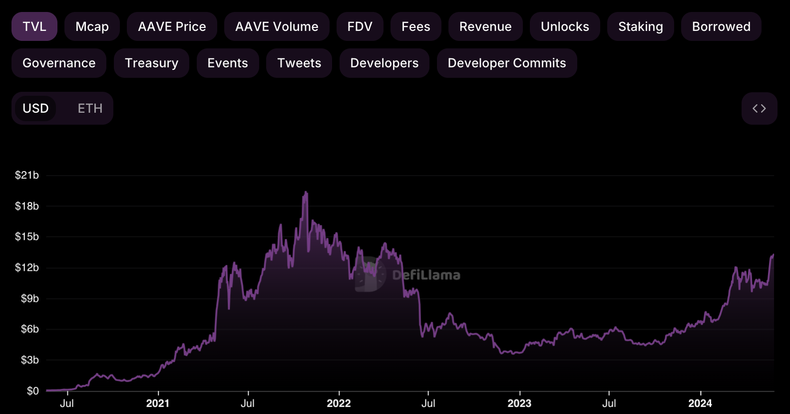 Aave hiện là giao thức cho vay lớn nhất trong lĩnh vực DeFi, với tổng giá trị tài sản bị khóa (TVL) ở mức 13,3 tỷ USD.