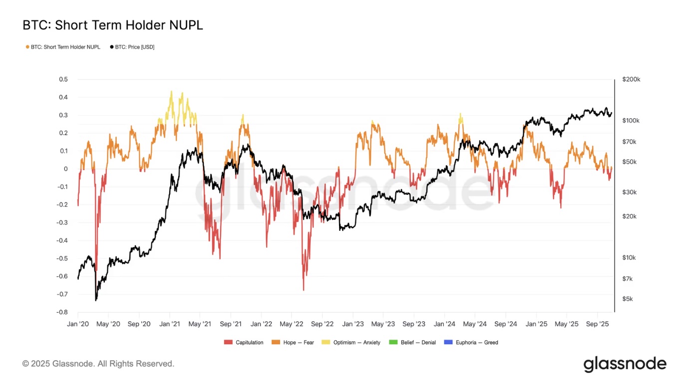 Nhà đầu tư ngắn hạn hiện đang bán lỗ, với chỉ số STH-NUPL ở mức –0,05 khi giá Bitcoin quanh 107.000 USD. Dù chưa đến ngưỡng hoảng loạn (–0,2), nhưng con số này cho thấy niềm tin đang giảm sút.