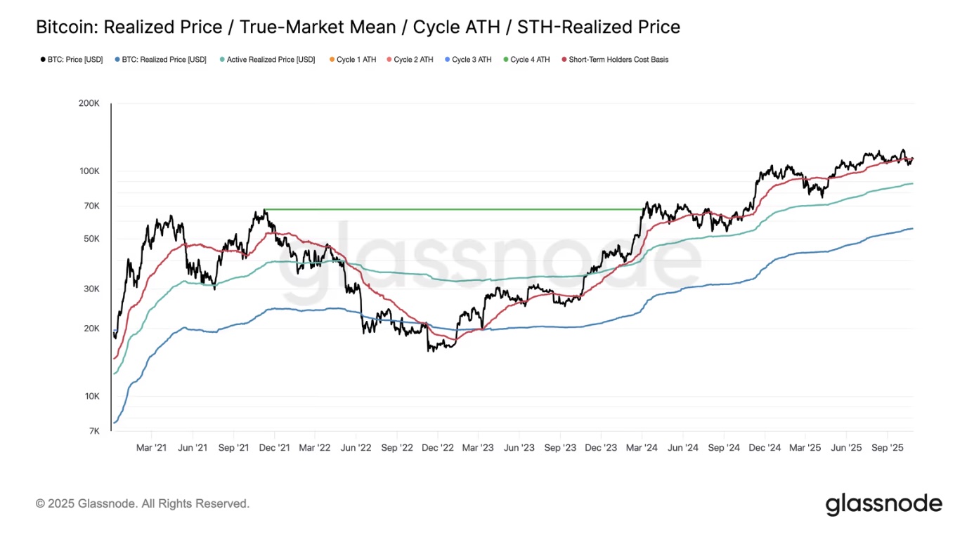 Báo cáo mới nhất của công ty cho thấy Bitcoin đang chật vật để vượt lại mức giá vốn trung bình của nhà đầu tư ngắn hạn (113.000 USD) — tức mức giá trung bình mà các nhà đầu tư mua trong 155 ngày gần đây. Ngưỡng này được xem là ranh giới quan trọng để duy trì xu hướng tăng. Việc liên tục thất bại khi thử vượt qua cho thấy động lực thị trường đang suy yếu.