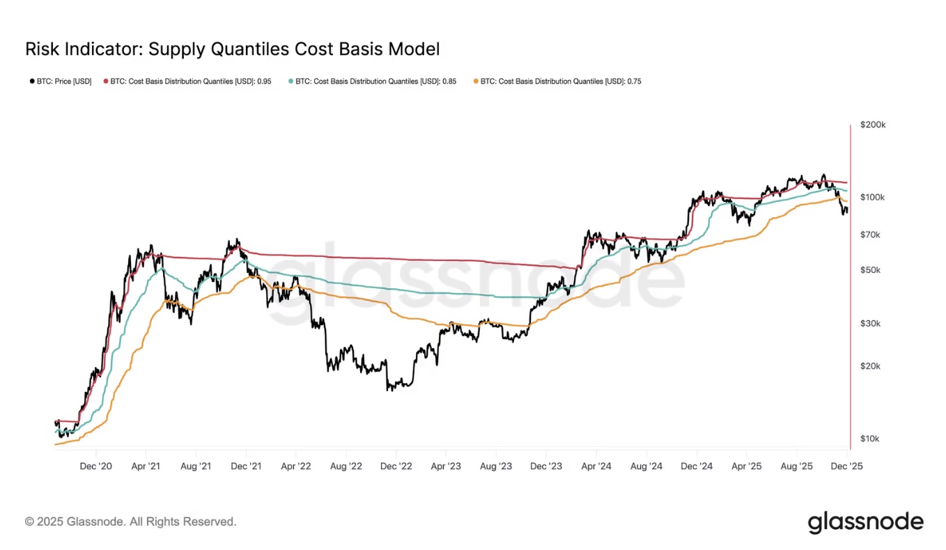 Chỉ báo đầu tiên cho thấy áp lực gia tăng là rủi ro đầu hàng từ nhóm mua đỉnh. Theo mô hình “supply quantiles cost basis (giá vốn theo các phân vị nguồn cung)” của Glassnode — theo dõi giá vốn của nguồn cung thuộc nhóm mua ở vùng giá cao — giá spot đã giảm xuống dưới ngưỡng 0,75 kể từ giữa tháng 11 và đang giao dịch quanh 96.100 USD. Điều này khiến hơn 25% nguồn cung BTC rơi vào trạng thái lỗ. Một diễn biến tương tự từng đánh dấu sự khởi đầu của thị trường gấu năm 2022.