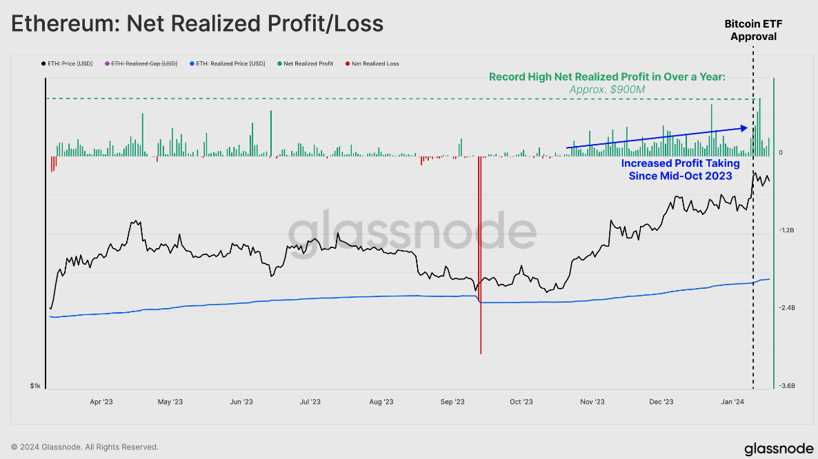 Đồng thời, khối lượng lợi nhuận ròng tăng đáng chú ý được nhà đầu tư Ethereum đảm bảo, đạt mức cao mới trong nhiều năm. Trong khi hoạt động chốt lời đang gia tăng kể từ giữa tháng 10, mức đỉnh vào ngày 13/1 đã vượt qua 900 triệu đô la mỗi ngày, cho thấy các nhà đầu tư đang tận dụng động lực được kịch bản “bán sự thật” tạo ra.
