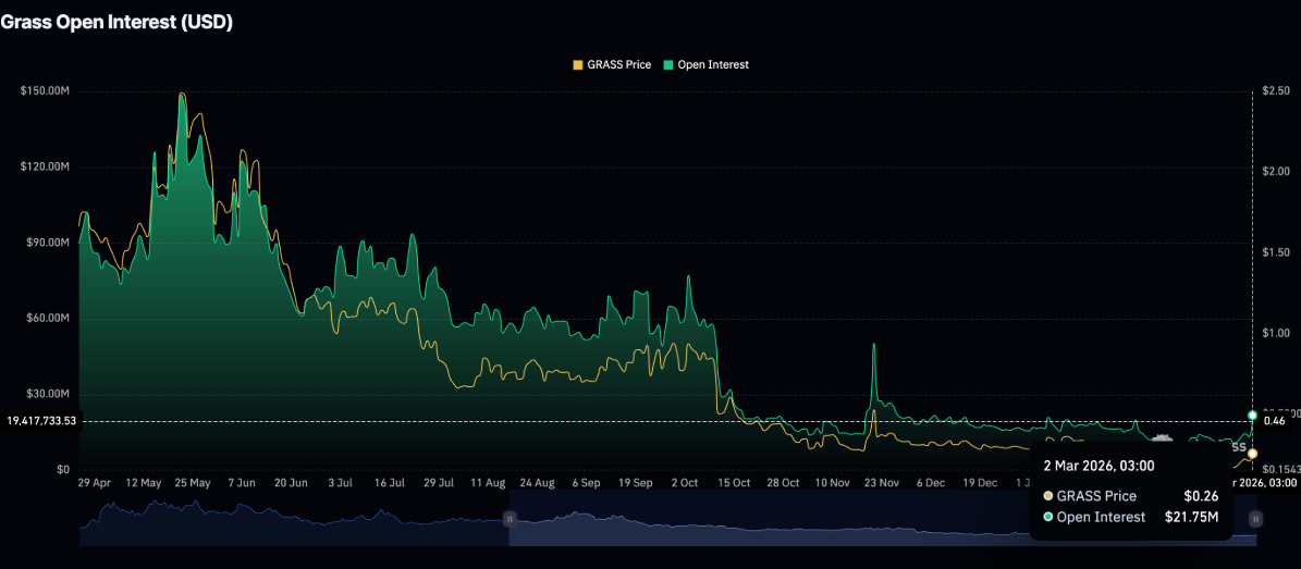 Bất chấp tâm lý “né rủi ro” vẫn phủ bóng lên toàn thị trường tiền điện tử, GRASS lại nổi lên như một điểm sáng, thu hút sự chú ý trở lại từ nhà đầu tư cá nhân. Trên thị trường phái sinh, lượng Hợp đồng mở (OI) – thước đo tổng giá trị danh nghĩa của các hợp đồng tương lai đang lưu hành – đã bật tăng mạnh lên gần 22 triệu USD trong ngày thứ Hai, so với mức 13,2 triệu USD của phiên liền trước.