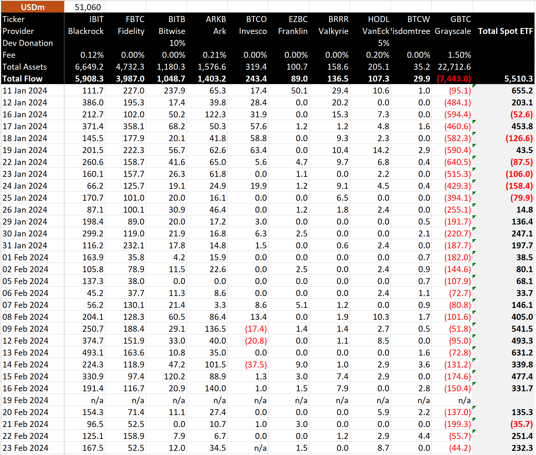 Ngược lại, thứ 6 đã chứng kiến hoạt động mạnh mẽ trên thị trường, với các quỹ Bitcoin ETF giao ngay mới ra mắt thu hút dòng tiền vào ròng hơn 232,3 triệu đô la. Dẫn đầu khoản này là IBIT của BlackRock, thu hút dòng vốn vào đáng kể 167,5 triệu đô la. FBTC của Fidelity theo sát với 52,5 triệu đô la, trong khi BITB của Bitwise đạt 12 triệu đô la. Dòng vốn tăng vọt làm nổi bật niềm tin ngày càng cao của nhà đầu tư đối với phương tiện đầu tư được quản lý trong không gian tiền điện tử.