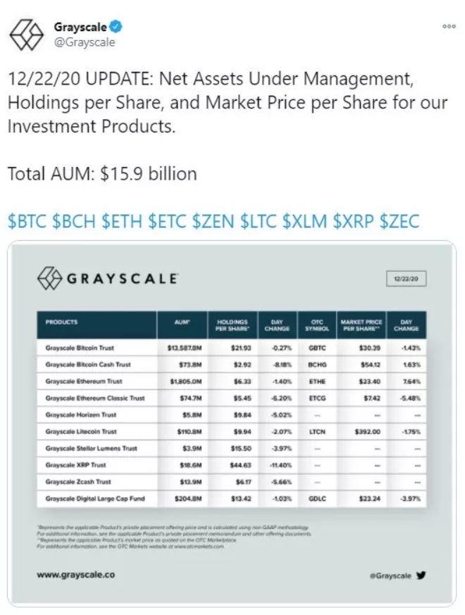 Tính đến ngày 22 tháng 12, Grayscale đã nắm giữ tổng cộng 15,9 tỷ đô la trị giá tiền điện tử. Bây giờ, họ có thể tự tin thêm 282.416.400 đô la khác vào số tiền này.