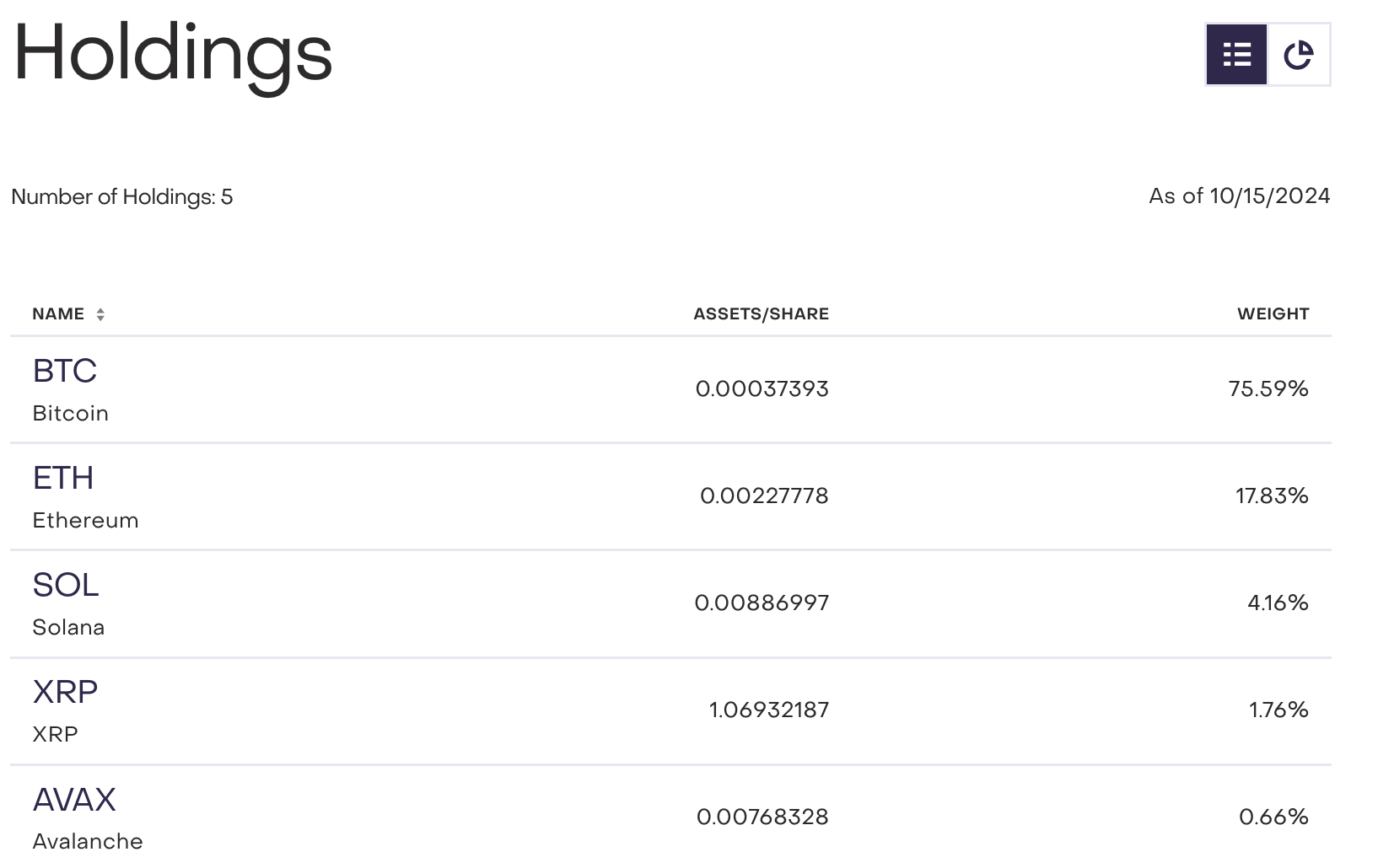 Digital Large Cap Fund của Grayscale, với mã chứng khoán GDLC, hiện đang giao dịch OTC với tổng tài sản được quản lý (AUM) đạt 524 triệu đô la. Quỹ này chủ yếu bao gồm Bitcoin chiếm 75,59%, Ethereum chiếm 17,83% và phần còn lại bao gồm Solana, XRP và Avalanche.