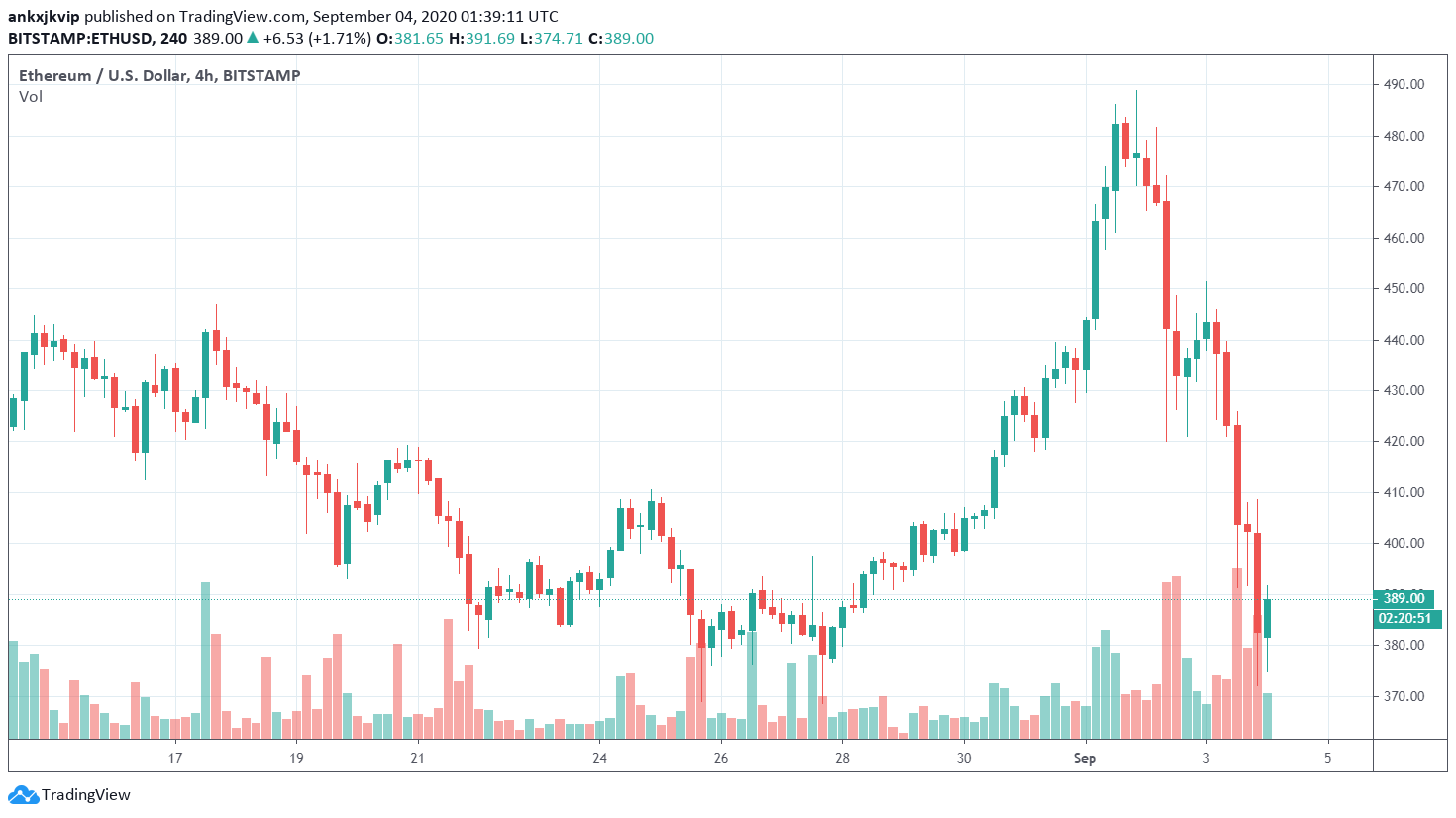 Ethereum, tiền điện tử lớn thứ hai tính theo vốn hóa thị trường, hôm nay đã giảm giá đáng kể sau khi đạt mức cao nhất trong hai năm là 488 đô la. ETH hiện giao dịch ở mức 389 đô la với mức giảm hơn 12%.