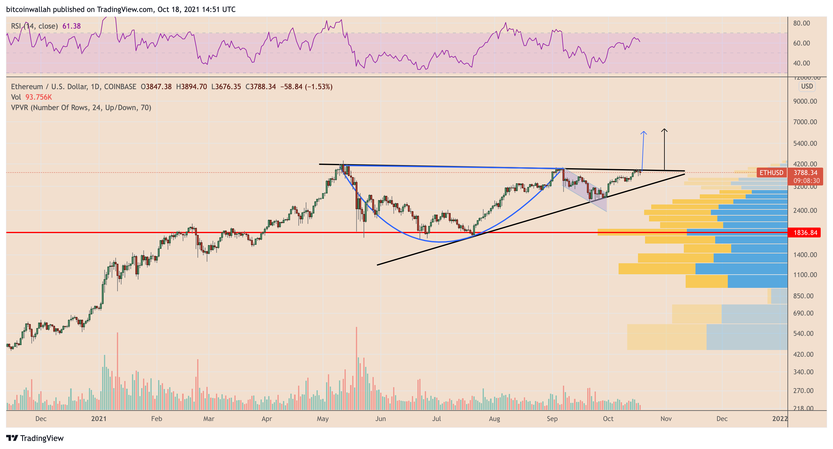 Biểu đồ giá ETH/USD hàng ngày và mô hình tam giác tăng dần (màu đen), cốc tay cầm (màu xanh lam) | Nguồn: TradingView