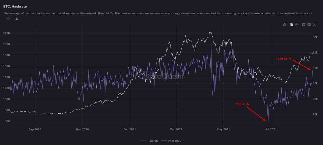 Hashrate Bitcoin đã có một sự phục hồi đáng kể kể từ khi sau sự cố đàn áp khai thác crypto của Trung Quốc vào quý 2. Hashrate hiện đã đạt 150 Exahashes, hoặc một nghìn tỷ tỷ hash mỗi giây.