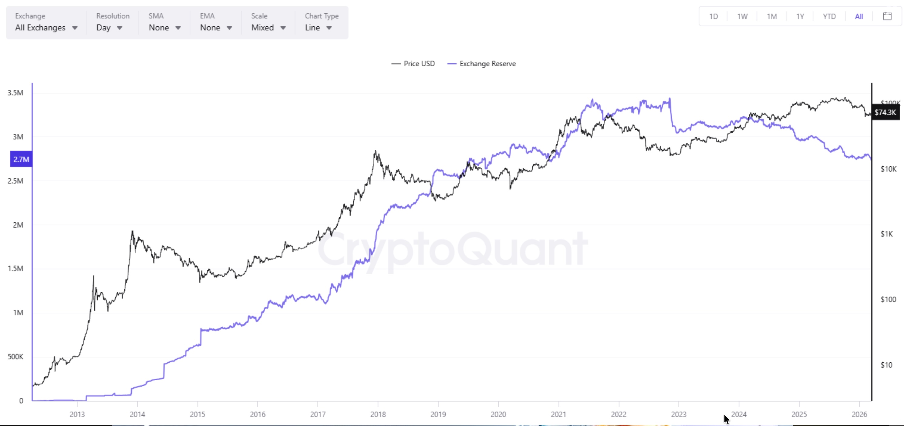 Ngoài ra, Martinez cho biết hơn 33.000 BTC đã được rút khỏi các sàn giao dịch trong tuần qua. Dữ liệu từ CryptoQuantcho thấy lượng Bitcoin lưu trữ trên các sàn gần đây đã giảm xuống mức thấp nhất trong sáu năm, khoảng 2,73 triệu BTC. Đây thường được xem là tín hiệu tích cực vì làm giảm áp lực bán ngay trên thị trường.