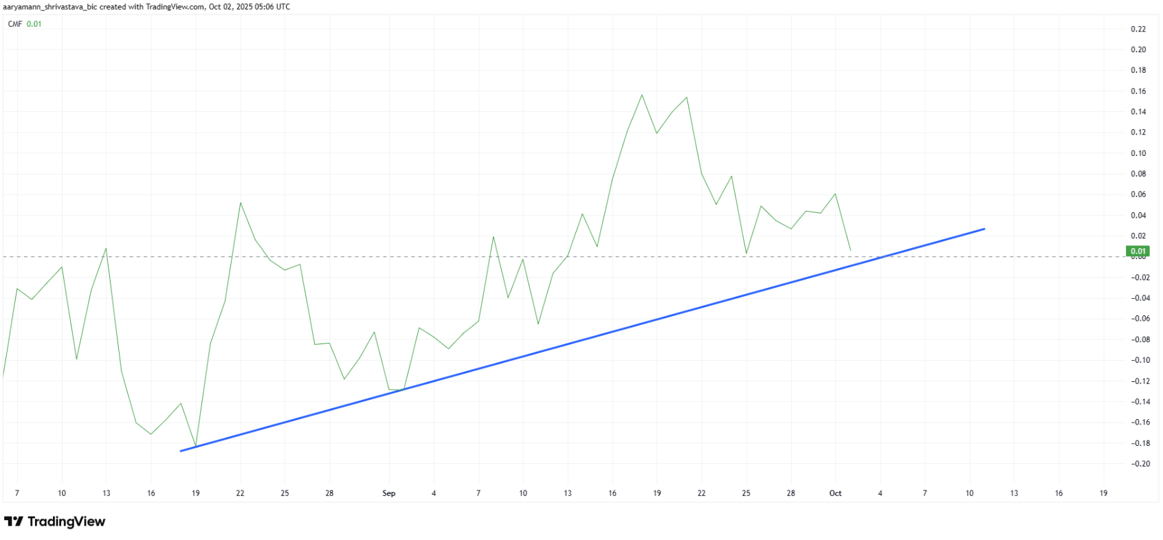 Đáng chú ý, chỉ báo Chaikin Money Flow (CMF) cũng đang gửi tín hiệu tích cực. Đà tăng đều đặn của CMF phản ánh dòng tiền liên tục chảy vào HBAR – dấu hiệu cho thấy nhu cầu thực sự gia tăng, một yếu tố thiết yếu để hỗ trợ quá trình phục hồi và thoát khỏi mô hình cái nêm giảm.