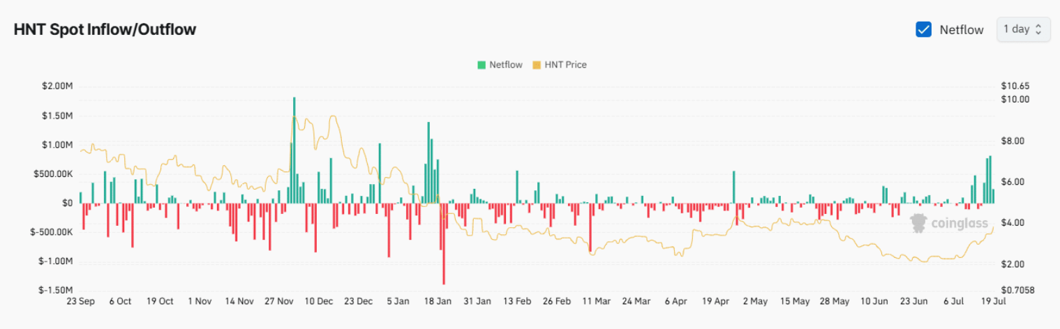 Theo dữ liệu từ CoinGlass, trong vòng bốn ngày qua, các trader trên thị trường giao ngay đã bán ra khoảng 2,17 triệu USD HNT — một dấu hiệu rõ ràng cho thấy áp lực chốt lời đang gia tăng. Xu hướng bán này được thể hiện qua các thanh màu xanh lớn trong vài ngày qua, phản ánh dòng tiền rút ra vẫn đang diễn ra đều đặn. Cùng lúc đó, thị trường phái sinh cũng ghi nhận những tín hiệu tương tự.