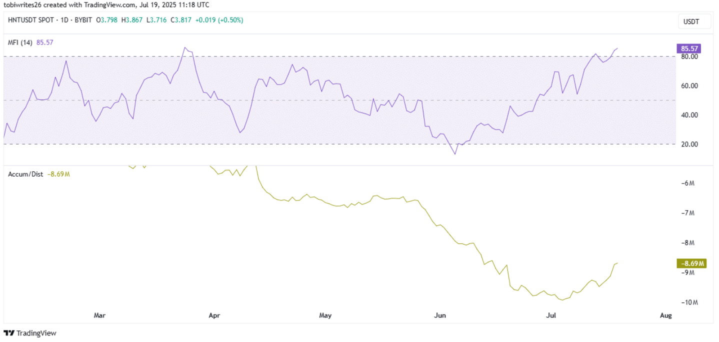 Chỉ số Money Flow Index (MFI), công cụ đo lường dòng vốn vào và ra khỏi tài sản, đã vượt ngưỡng 80 — vùng được xem là quá mua. Điều này cho thấy HNT có thể đang bị thổi phồng về giá trị và đứng trước nguy cơ điều chỉnh trong ngắn hạn.