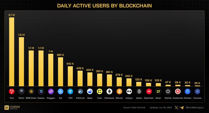 Tại thời điểm viết bài, mạng Tron có hơn 2,1 triệu người dùng. BNB đứng thứ ba, với số lượng người dùng hoạt động trên mạng là 1,08 triệu.