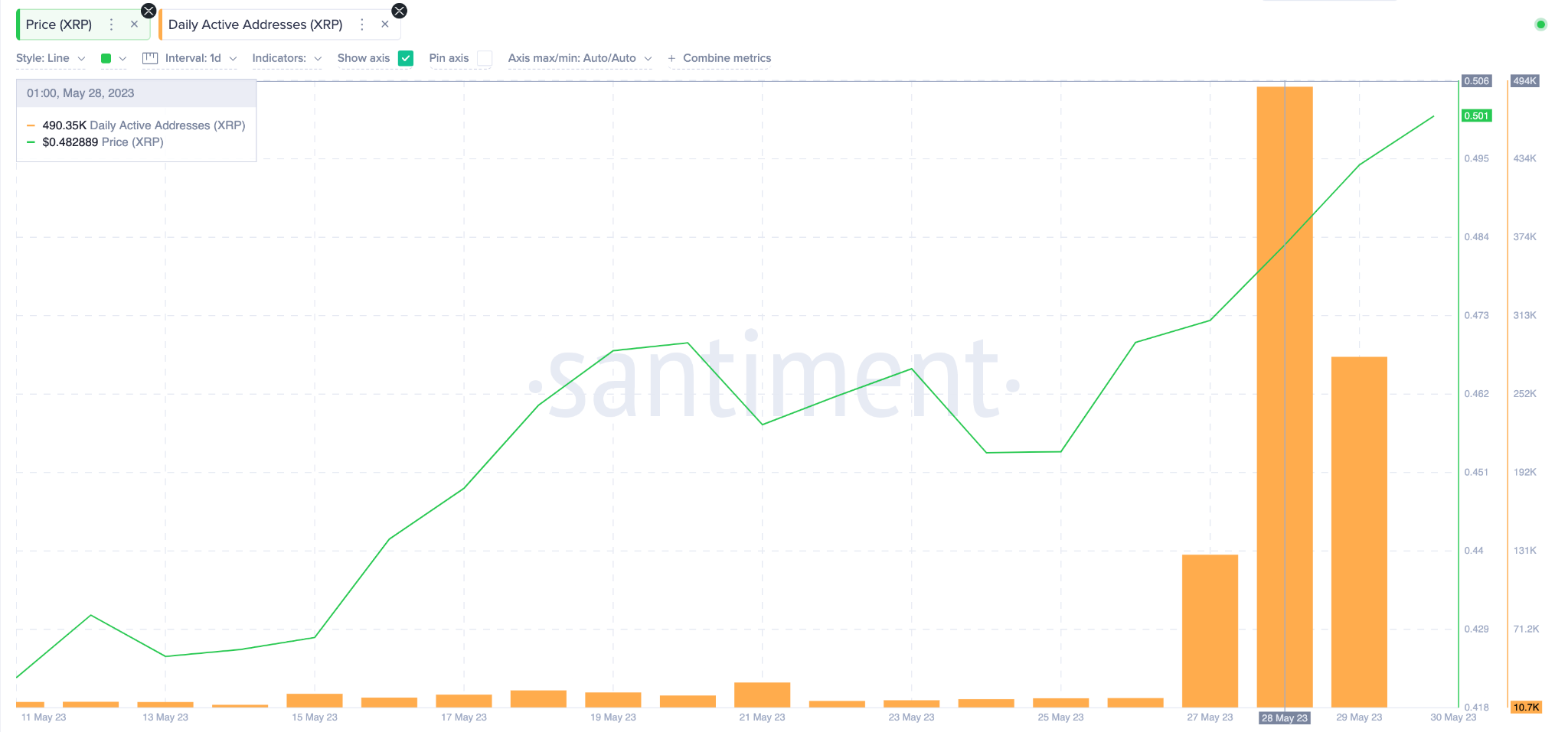 Vào ngày 30/5, giá XRP lần đầu tiên vượt qua ngưỡng kháng cự quan trọng 0,5 đô la kể từ ngày 19/4. XRP có xu hướng tăng kể từ ngày 11/5, sau khi phục hồi từ mức thấp gần đây là 0,42 đô la. Tuy nhiên, đợt tăng giá hiện tại dường như càng được tiếp thêm sức mạnh sau khi hoạt động mạng tăng vọt hơn 2.600% vào ngày 27/5.