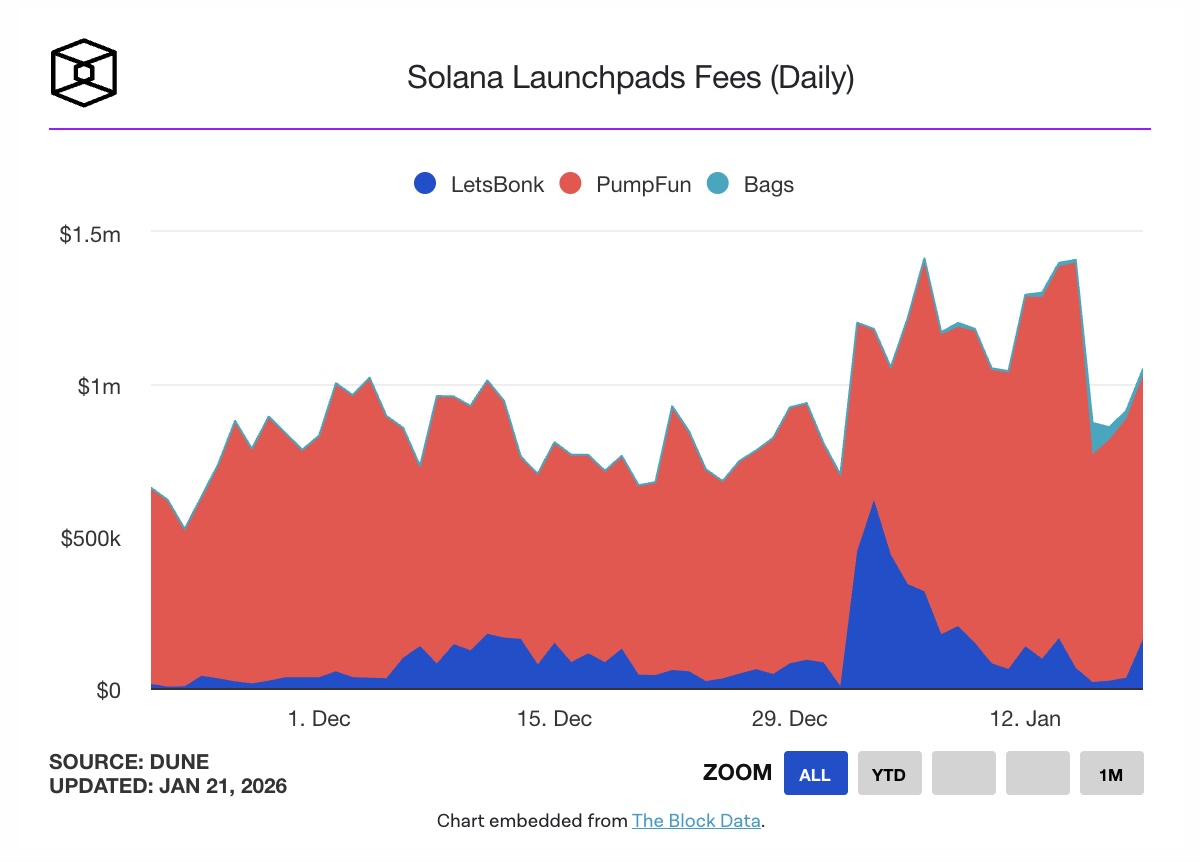 Phí trên launchpad Bags đã tăng vọt lên hơn 100.000 USD trong ngày 16/1, cao hơn khoảng 16.000% so với mức trung bình ngày trong tháng 12 chỉ khoảng 640 USD. Đây cũng là ngày ghi nhận doanh thu cao nhất kể từ khi nền tảng này ra mắt. Trong cùng giai đoạn, số lượng token “tốt nghiệp” từ Bags đã vượt qua Pump.fun – vốn được xem là chuẩn mực lâu nay đối với các đợt phát hành token trên hệ Solana.