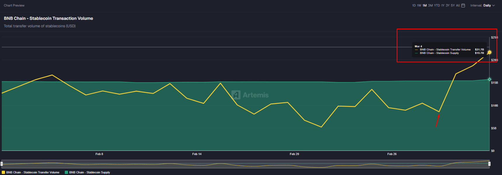 Đáng chú ý, BNB Chain gần đây đã ghi nhận 21,7 tỷ USD giá trị chuyển stablecoin trong một ngày, mức cao nhất trong vòng một năm, cho thấy nhu cầu giao dịch trên mạng lưới đang gia tăng mạnh mẽ.