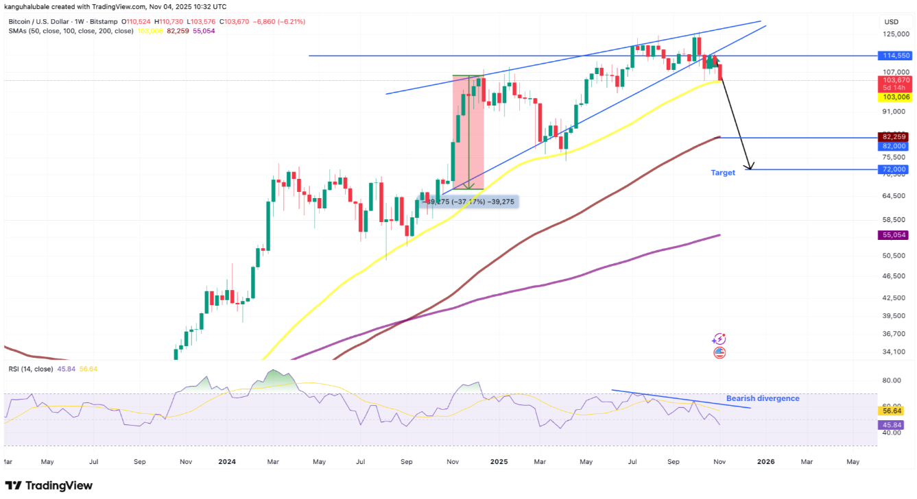 Biểu đồ tuần của cặp BTC/USD vừa xác nhận mô hình cái nêm giảm khi giá phá vỡ hỗ trợ từ đường xu hướng dưới của mô hình tại 114.550 USD. Hiện tại, phe bò đang nỗ lực giữ giá trên đường trung bình động đơn giản (SMA) 50 tuần, quanh mức 103.000 USD.
