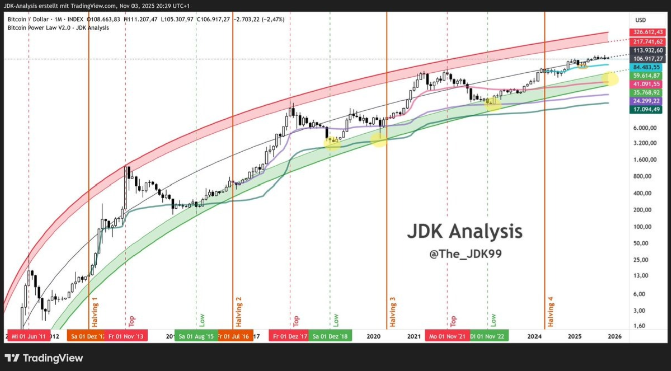 Biểu đồ hàng tháng BTC/USD với Mô hình Power law | Nguồn: JDK Analysis