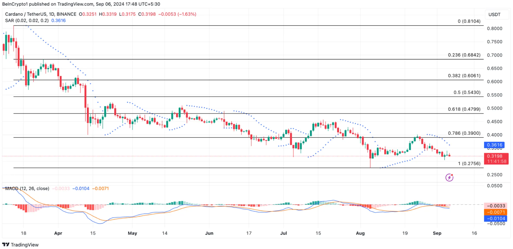 Các trader thường coi đây là tín hiệu bán, tạo áp lực tiêu cực lên giá của tài sản. Nếu xu hướng giảm tiếp tục, giá ADA sẽ quay lại mức thấp nhất ngày 5 tháng 8 là $0,27.