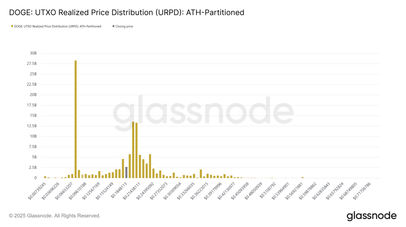 Theo dữ liệu Realized Price Distribution, vùng giá $0,19–$0,20 đang là khu vực cung mạnh, nơi tập trung gần 18% tổng lượng DOGE lưu hành. Điều đó cho thấy phần lớn nhà đầu tư đã mua vào trong phạm vi này hiện đang rơi vào trạng thái thua lỗ (“underwater”) khi giá giảm xuống dưới $0,20.
