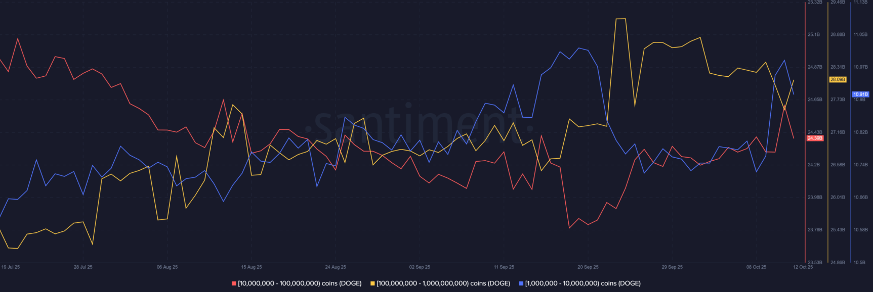 Cùng thời điểm, dữ liệu từ Santiment cho thấy phần lớn các ví cá voi hàng đầu tiếp tục cắt giảm vị thế, càng củng cố cho xu hướng giảm đang bao trùm thị trường. Trong bối cảnh đó, khả năng DOGE thực hiện một đợt bật tăng mạnh từ vùng hỗ trợ ngày càng trở nên xa vời.