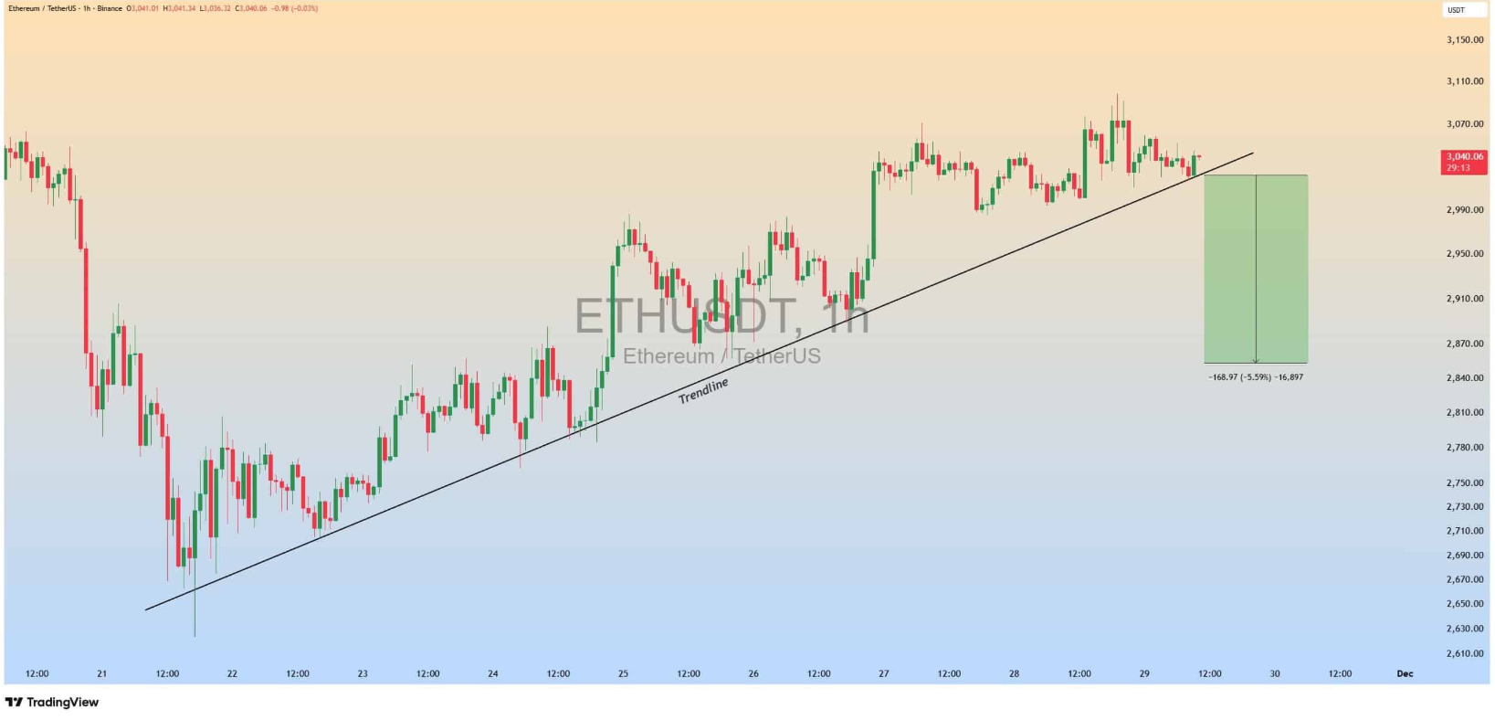Tuy nhiên, rủi ro từ dòng vốn rút ra có thể khiến Ethereum phá vỡ đường xu hướng này. Trong trường hợp đó, giá có thể điều chỉnh giảm khoảng 5–6%, trở lại dưới mốc 3.000 USD.