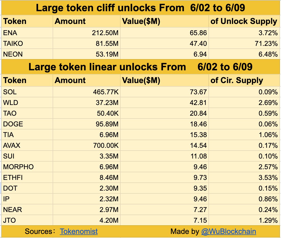 Bên cạnh đó, nhiều dự án sẽ tiếp tục mở khóa theo dạng tuyến tính với giá trị trên 1 triệu USD mỗi ngày, bao gồm: SOL, WLD, TIA, DOGE, TAO, AVAX, SUI, DOT, IP, MORPHO, NEAR, ETHFI, JTO và nhiều cái tên khác.