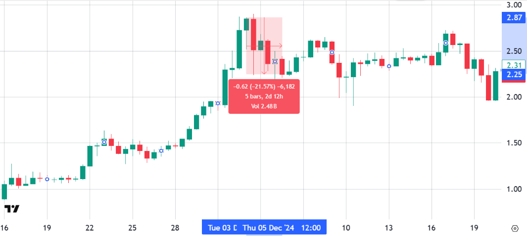 Tỷ lệ tài trợ 8 giờ của XRP vẫn gần bằng 0 kể từ ngày 9 tháng 12, cho thấy nhu cầu đòn bẩy cân bằng giữa phe mua và phe bán. Đợt tăng đột biến ngắn hạn gần đây nhất về nhu cầu đòn bẩy xảy ra vào ngày 4 tháng 12 năm 2024, sau đợt tăng giá 140% của giá XRP trong hai tuần. Đáng chú ý, đỉnh điểm của áp lực mua này diễn ra trước đợt điều chỉnh mạnh 22% trong vòng chưa đầy ba ngày.
