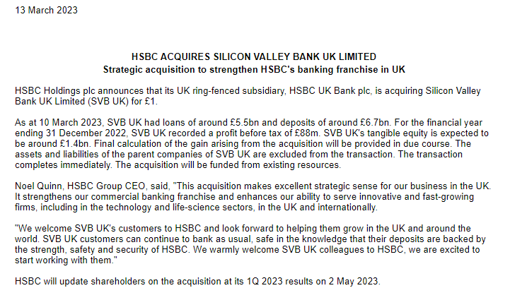 Theo tin tức gần đây, HSBC sẽ mua lại chi nhánh SVB tại Vương quốc Anh với giá hơn một đô la một chút. SVB UK có khoản vay khoảng 6,7 tỷ đô la và tiền gửi khoảng 8,1 tỷ đô la tính đến ngày 10 tháng 3 năm 2023.