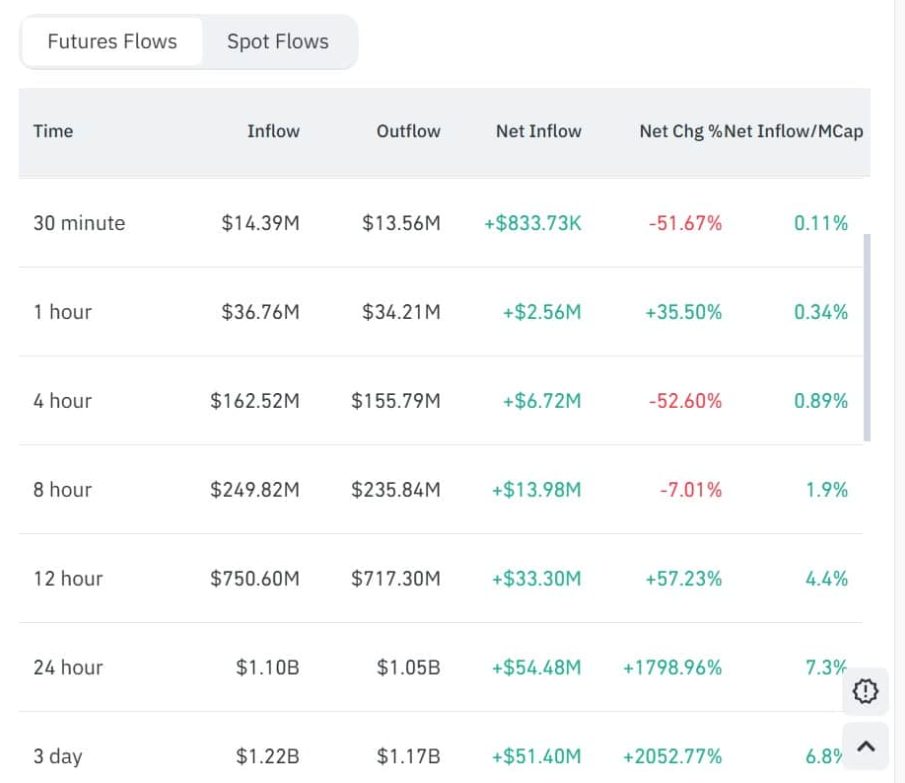 Đáng chú ý, dòng vốn đổ vào thị trường Futures vẫn duy trì ở mức cao trong ba ngày liên tiếp, đạt 1,22 tỷ USD. Riêng Humanity chứng kiến dòng vốn vào Futures đạt 1,1 tỷ USD, trong khi dòng vốn rút ra chỉ ở mức 1,05 tỷ USD — giúp dòng vốn ròng tăng vọt 1.798% lên 54,48 triệu USD, phản ánh sức hút ngày càng mạnh mẽ từ giới đầu tư.