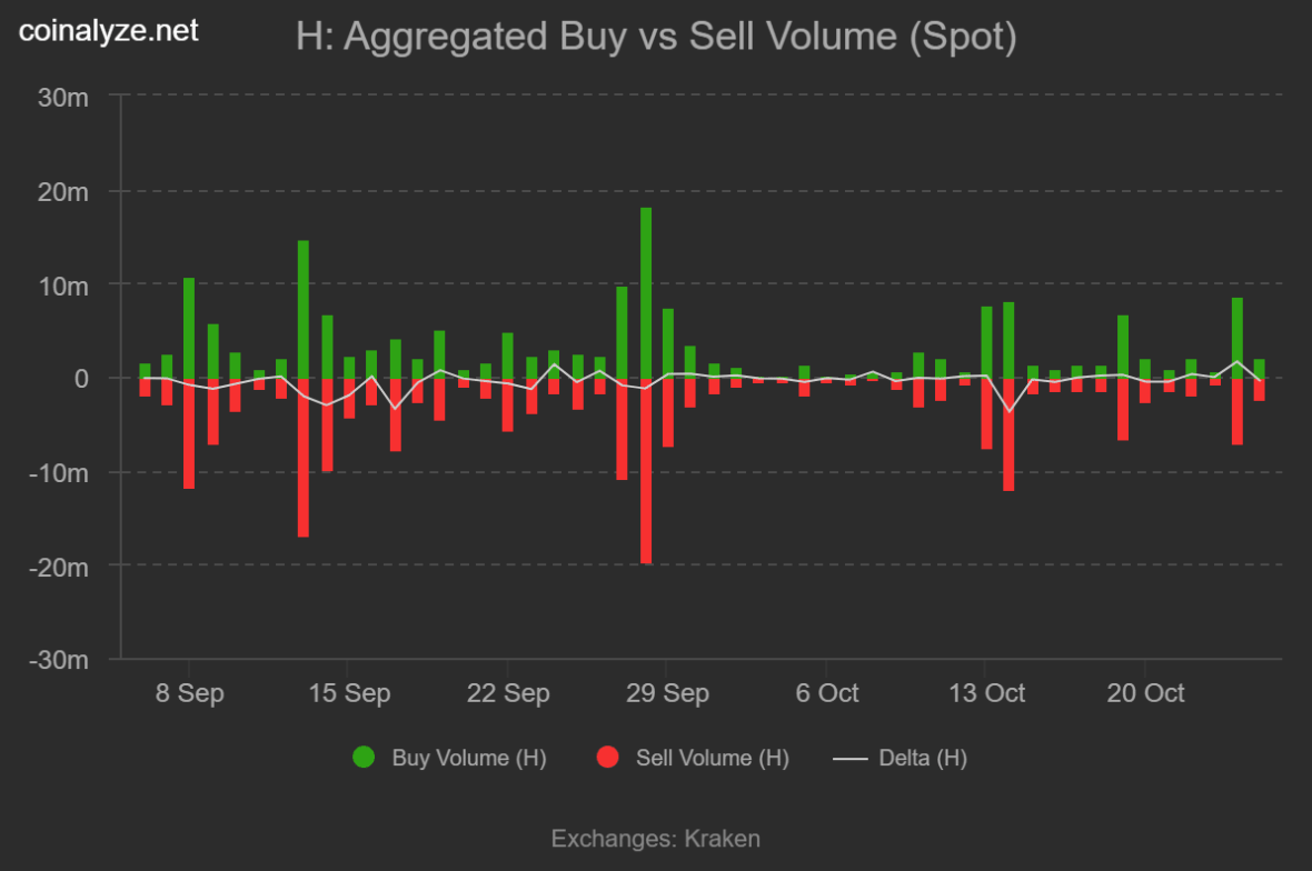 Theo dữ liệu từ Coinalyze, khối lượng bán đã đạt 2,41 triệu — vượt qua khối lượng mua 2 triệu — tạo ra delta âm 401.000, cho thấy áp lực bán giao ngay đang gia tăng rõ rệt.