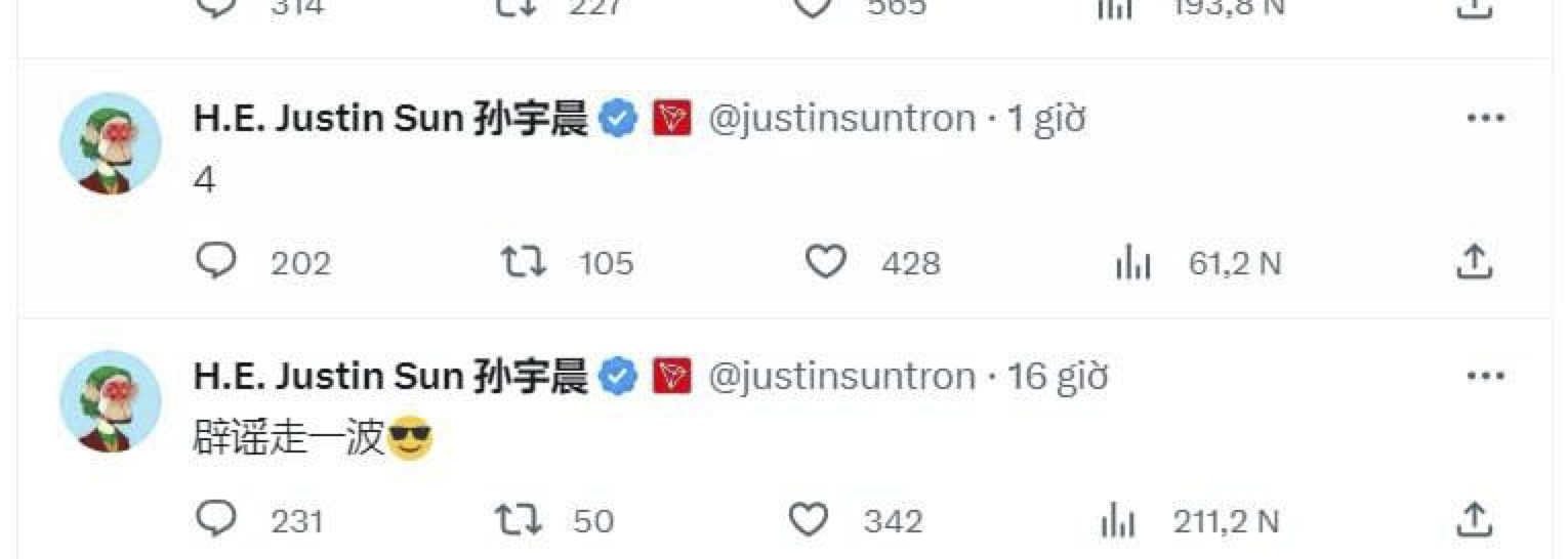 Justin Sun đã phản ứng với tình huống này theo cách tương tự như CZ, Giám đốc điều hành của Binance, bằng cách tweet một con số “4”, có nghĩa là FUD.