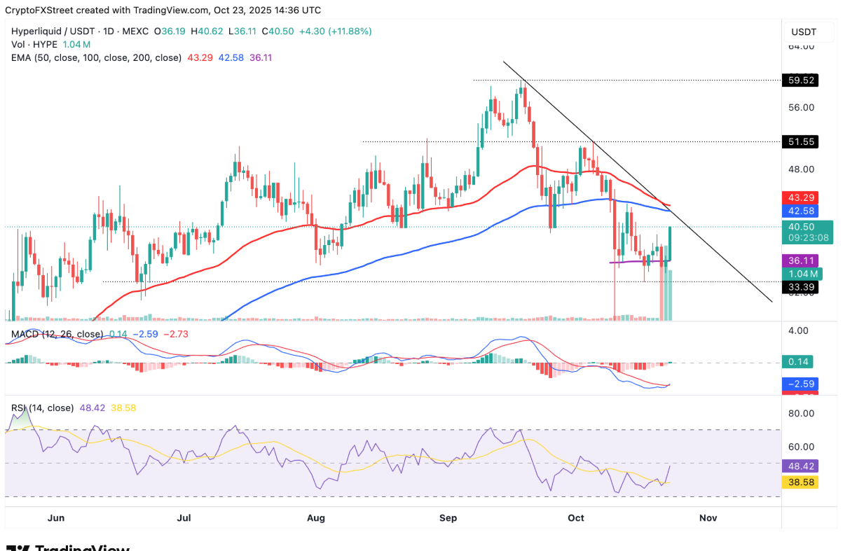 Hyperliquid đang ghi nhận mức giao dịch trên 40,00 USD vào thứ Năm, được hỗ trợ vững chắc bởi đường trung bình động hàm mũ (EMA) 200 ngày tại 36,11 USD. Cây nến nhấn chìm tăng trưởng trên biểu đồ ngày phản ánh rõ ràng tâm lý tích cực bao trùm thị trường tiền điện tử.