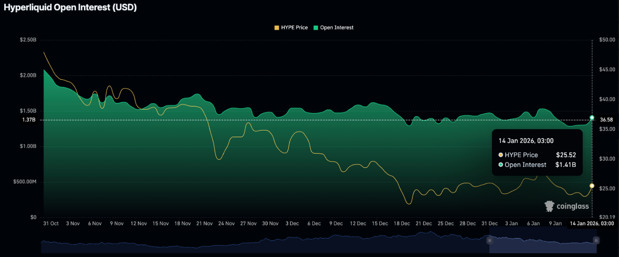 Song song đó, thị trường phái sinh của Hyperliquid cũng phát đi tín hiệu lạc quan khi hợp đồng mở (OI) của hợp đồng tương lai tăng lên 1,41 tỷ USD vào thứ Năm, so với mức 1,3 tỷ USD của ngày trước đó. Sự gia tăng OI — đại diện cho tổng giá trị danh nghĩa của các hợp đồng đang mở — cho thấy dòng tiền từ nhà đầu tư cá nhân đang quay trở lại, đồng thời phản ánh kỳ vọng về một nhịp bứt phá giá trong ngắn hạn.