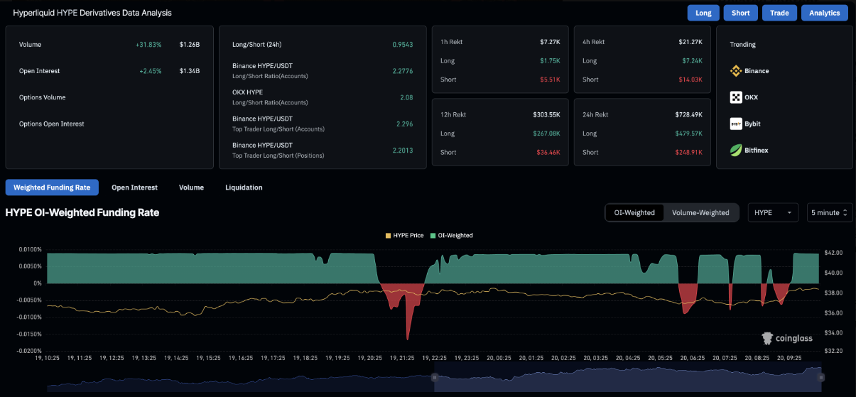 Theo dữ liệu từ CoinGlass, tổng giá trị hợp đồng mở (OI) của HYPE đã đạt 1,34 tỷ USD vào thứ Hai, tăng 2,45% chỉ trong 24 giờ. Con số này cho thấy tâm lý hứng khởi và sẵn sàng chấp nhận rủi ro cao hơn của các trader, khi họ liên tục mở thêm vị thế mua và đẩy mạnh sử dụng đòn bẩy để đón đầu đà tăng giá tiềm năng.
