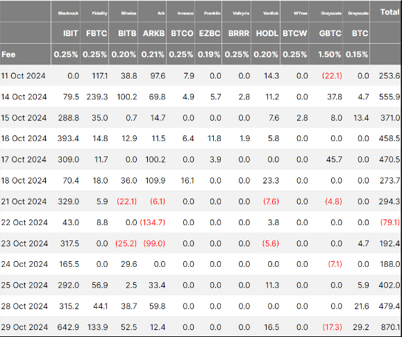 Trong ngày 29 tháng 10, các ETF Bitcoin đã tạo ra dòng tiền ròng tích lũy trị giá 870 triệu USD, đánh dấu ngày dòng tiền vào cao thứ hai kể từ ngày 12 tháng 3, khi các ETF tích lũy được hơn 1 tỷ USD.