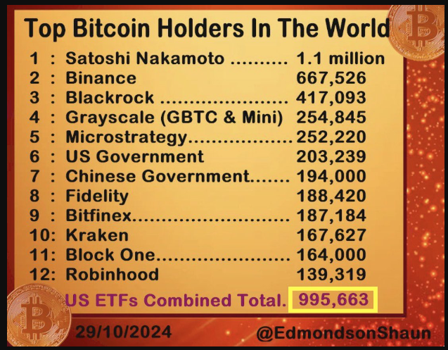 Điều này có thể khiến Bitcoin ETF trở thành holder Bitcoin lớn nhất thế giới ngay từ tháng 11 này, vượt qua ví của Satoshi Nakamoto, vốn đang nắm giữ hơn 1,1 triệu BTC.