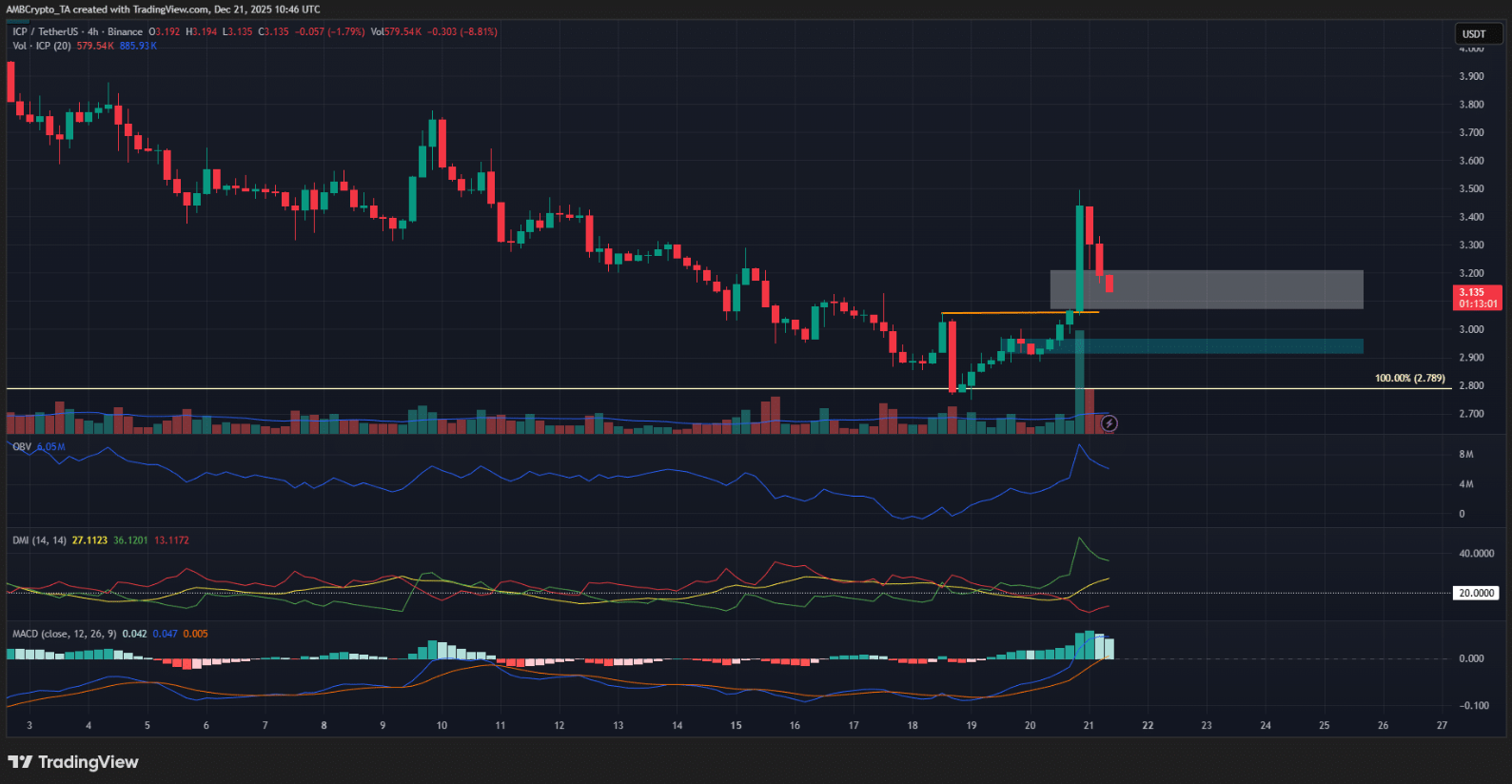 Biểu đồ khung 4 giờ cho thấy một vùng mất cân bằng giá đáng chú ý quanh mốc 3,2 USD, được đánh dấu bằng màu trắng. Khu vực này hình thành ngay sau khi cấu trúc tăng giá bị phá vỡ, cho thấy động lực thị trường đã suy yếu rõ rệt. Tại thời điểm viết bài, ICP đang bước vào nhịp điều chỉnh ngắn hạn, ghi nhận mức giảm 8,46% chỉ trong chưa đầy 12 giờ, phản ánh áp lực chốt lời gia tăng.