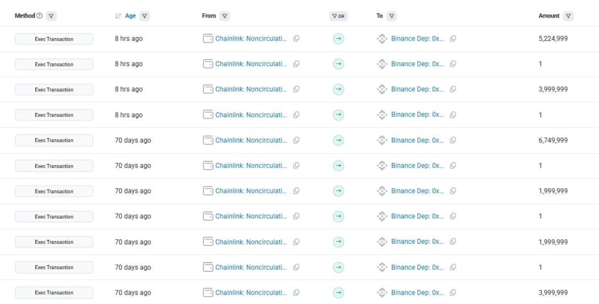 Trong số này, 9,23 triệu LINK – tương đương khoảng 116 triệu USD – đã được chuyển lên sàn Binance thông qua hai đợt nạp lớn. Cụ thể, một giao dịch ghi nhận khoảng 5,22 triệu LINK, trong khi giao dịch còn lại chuyển gần 4,0 triệu LINK. Phần còn lại, 2,02 triệu LINK (xấp xỉ 25 triệu USD), được chuyển sang một ví multisig có liên kết với hệ sinh thái Chainlink.