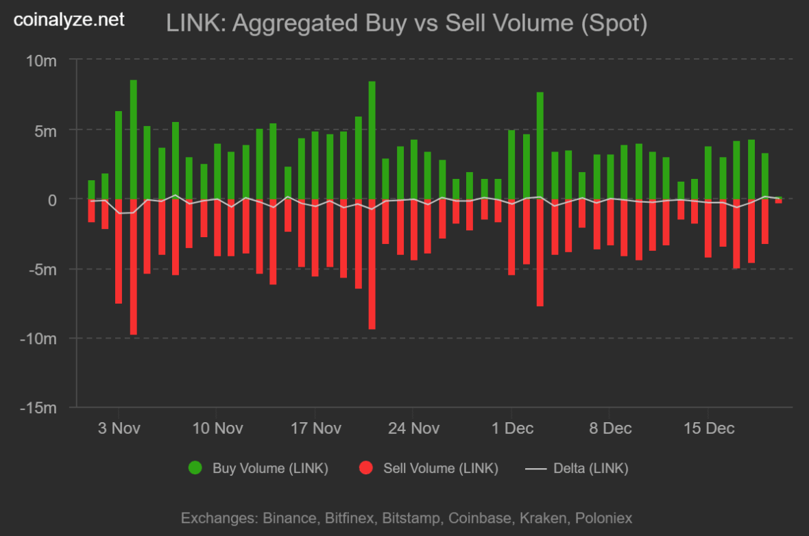 Động thái này đã kích hoạt lực cầu bắt đáy, giúp altcoin bật tăng trở lại. Dữ liệu từ Coinalyze cho thấy khối lượng mua đạt khoảng 3,5 triệu LINK, vượt nhẹ so với 3,2 triệu LINK ở phía bán.