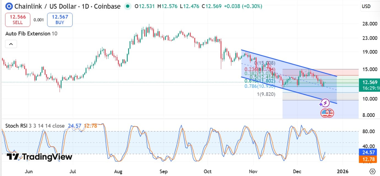 Trên khung thời gian ngày, giá Chainlink (LINK) đã bật tăng trở lại từ đáy 11,7 USD và đang được giao dịch quanh mức 12,5 USD tại thời điểm viết bài.
