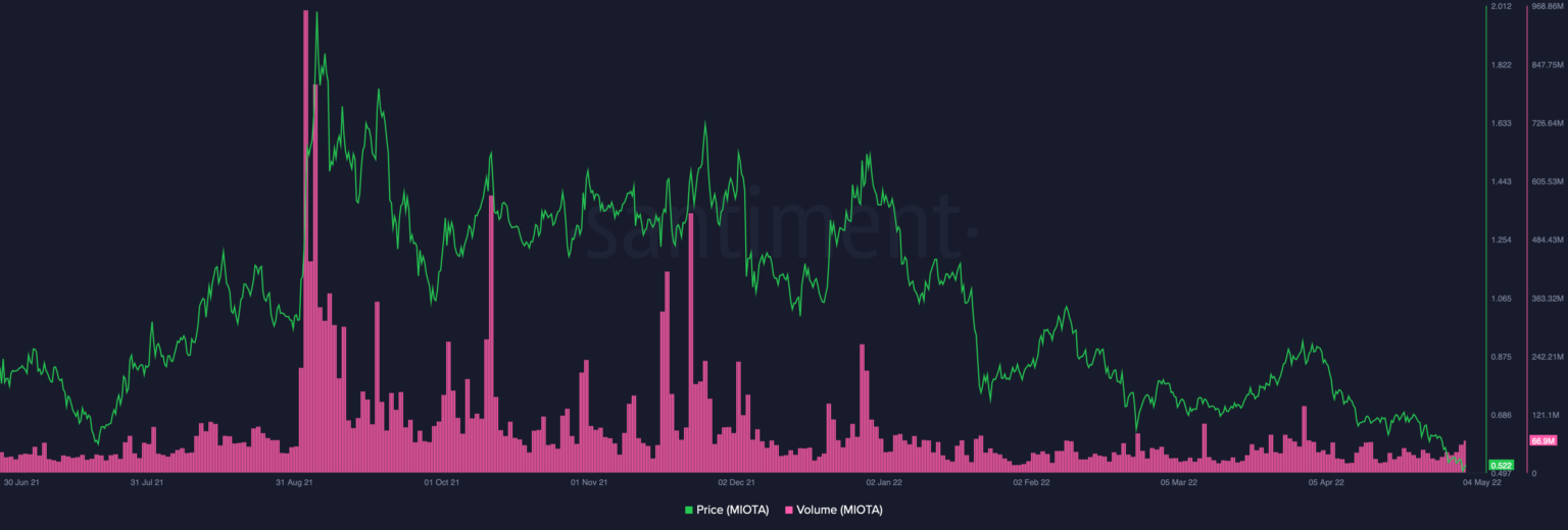 Theo dữ liệu từ Santiment, khối lượng MIOTA trước đây giảm song song với giá. Tuy nhiên, khối lượng tăng chậm vào thời điểm viết bài. Mặc dù khác xa so với diễn biến gia tăng ngoạn mục được ghi nhận từ tháng 8 đến tháng 12/2021, dữ liệu mới nhất cho thấy khối lượng đang dần trở lại.