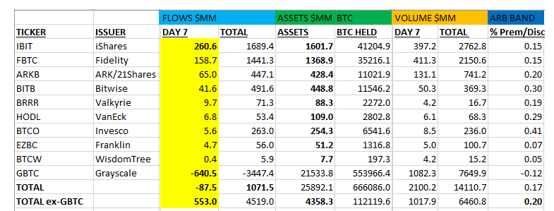 Khối lượng và dòng vốn của Bitcoin ETF trong ngày giao dịch thứ 7 | Nguồn: Eric Balchunas