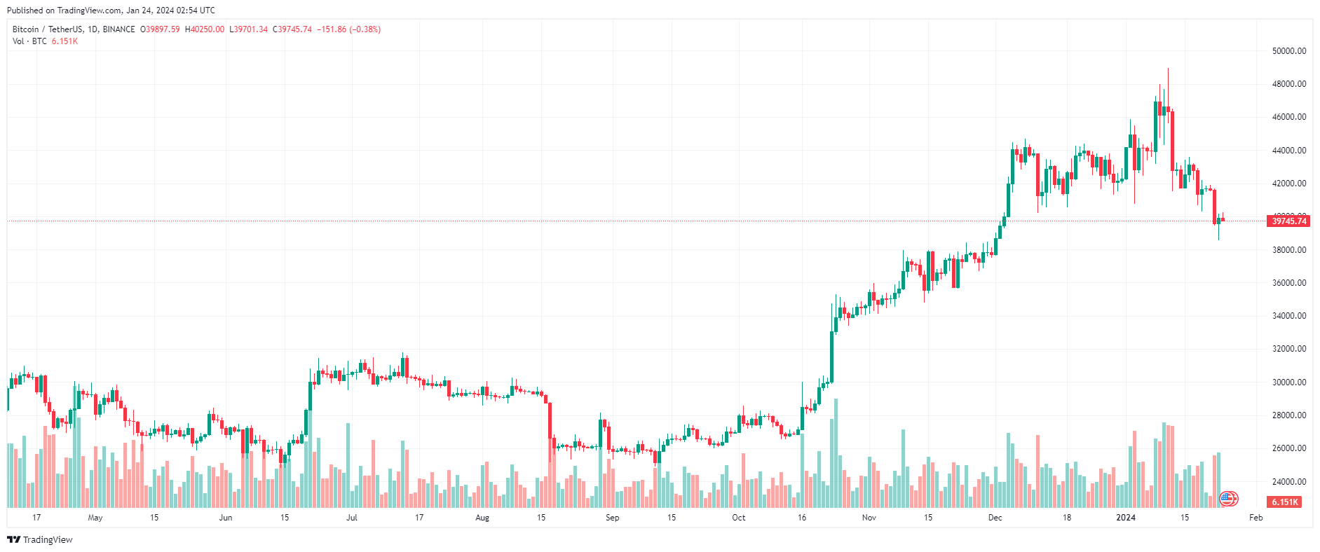 Giá BTC giảm xuống dưới $ 39.000 | Nguồn: TradingView