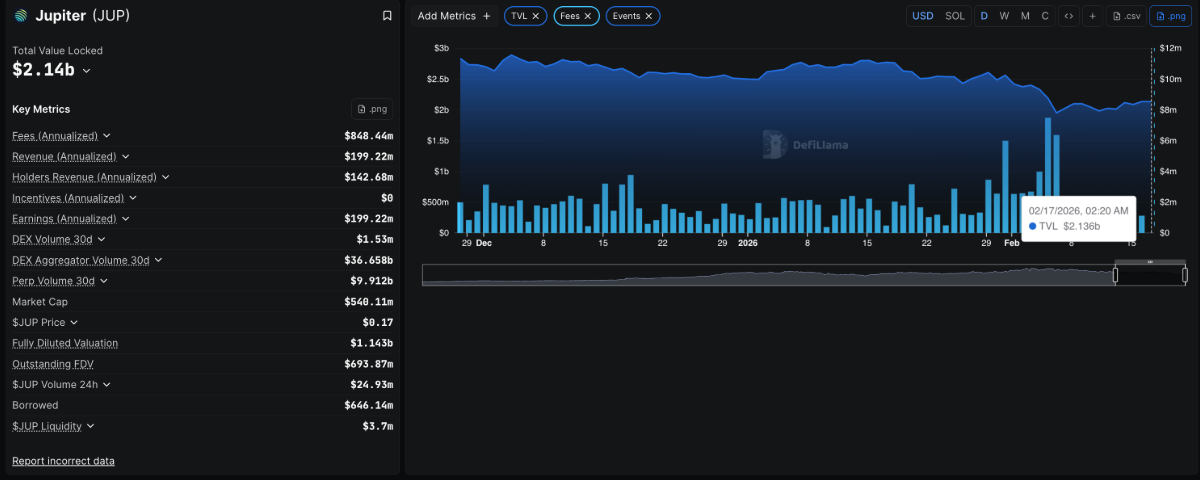 Theo dữ liệu từ DeFiLlama, tổng giá trị bị khóa (TVL) trên Jupiter đã đạt 2,14 tỷ USD vào thứ Ba, tăng đáng kể so với mức 1,95 tỷ USD ghi nhận ngày 6/2. Đà tăng này phản ánh lượng tiền gửi ngày càng lớn từ người dùng, cho thấy dòng vốn mới đang chảy mạnh vào hệ sinh thái Jupiter cùng mức độ quan tâm ngày một gia tăng.