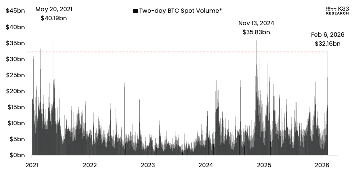 Diễn biến giá đi kèm với hoạt động giao dịch “siêu sôi động”, theo Lunde. Khối lượng giao ngay Bitcoin trong hai ngày đạt 32 tỷ USD vào ngày 6/2, thuộc nhóm cao nhất từng ghi nhận. Riêng hai phiên 5/2 và 6/2 đều nằm trong nhóm 5% phiên có khối lượng lớn nhất trong lịch sử — hiện tượng chỉ từng xuất hiện một lần trong 5 năm qua, vào thời điểm sụp đổ của FTX.