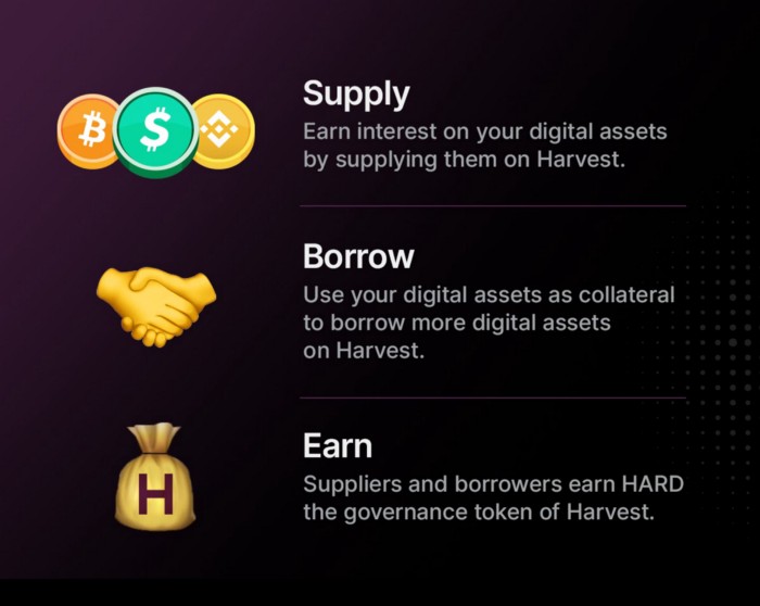 Tại Harvest, người dùng có thể vay, cho vay nhiều loại tiền điện tử và nhận thưởng bằng token HARD.