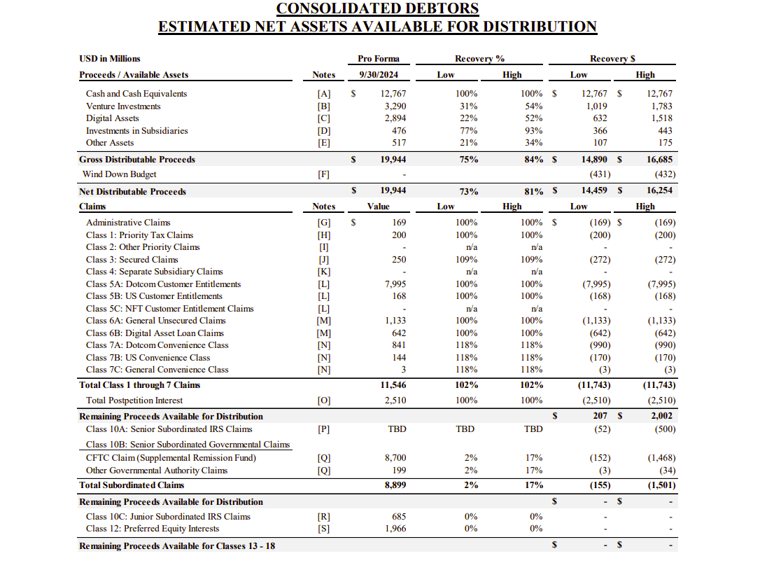 Dù tổng số tiền phân phối ước tính từ tài sản của FTX có thể dao động trong khoảng từ 14,7 tỷ đến 16,5 tỷ đô la, nhưng vòng chi trả đầu tiên sẽ không đạt tới con số này do ưu tiên thanh toán cho các khoản yêu cầu bồi thường dưới 50.000 đô la, được gọi là “convenience classes” (nhóm người được ưu tiên chi trả nhanh chóng, đơn giản, với các yêu cầu bồi thường nhỏ hoặc dễ giải quyết hơn).