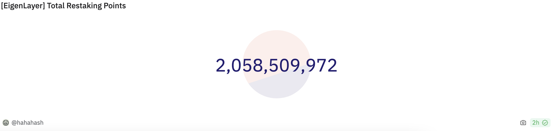 Người gửi tiền EigenLayer nhận được 24 point mỗi ngày cho mỗi Ether mà họ restake và tính đến nay, đã có hơn 2 tỷ EigenLayer point tồn tại với 67 triệu điểm dự kiến sẽ được phát hành mỗi ngày.