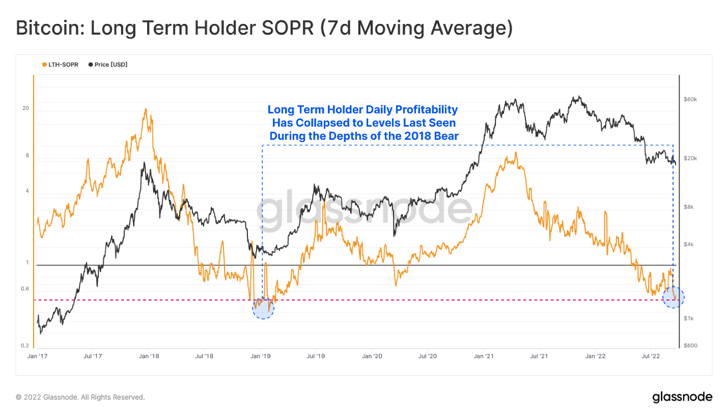 Đây là khoảng thời gian thị trường chạm đáy trong chu kỳ giảm giá trước đó. Báo cáo cũng tuyên bố holder dài hạn đang bán với mức lỗ trung bình 42% theo chỉ số LTH-SOPR.